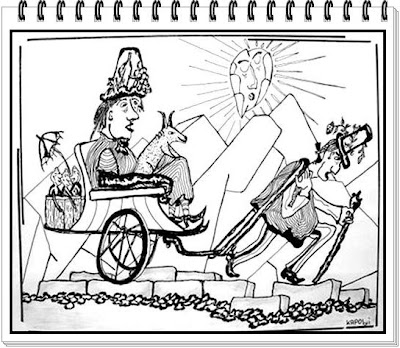 Kitaposott fekete férfi félcipői szánalmasan lógtak csoszogó-oszlop lábain, keblei hordó hasán szétterülve ringatóztak cammogó járásának ütemére.