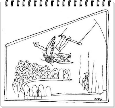 Valahogy magával rántották a történések, ő sem értette az egészet, érzékelte, ebből egy sosem látott botrányos kimenetelű dolog lesz, mégsem tudta rávenni magát, hogy a lengést abbahagyja. Végtelen nyugalom és közöny lett rajta úrrá – álomban élte meg a jelent – szemei előtt összefolytak az események a valóság euforikus meglétével. Kezei tőle független vaskampókként szorították a hinta rúdját, lógva száguldott a levegőben, mint hatalmas inga. Kavargó fények, sugdolózás, a suhanás tompa-surlódó hangjai összekeveredtek a kupolában, a falnak csapódva visszaömlöttek röpködő alakjára, lefolyva mindenre, ami alatta élt és várakozott.