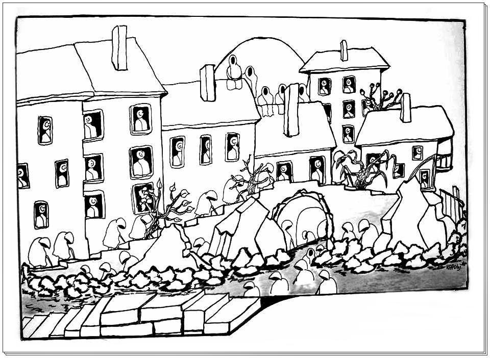Aztán szegfűket dugunk a puskák csövébe, a díszlépésektől visszhangzik a világ, a szeges talpú bakancsok szikrát vetnek a macskaköveken, és az euforikus tömeg fetreng, integet, és megüdvözül a gyönyörűségtől.