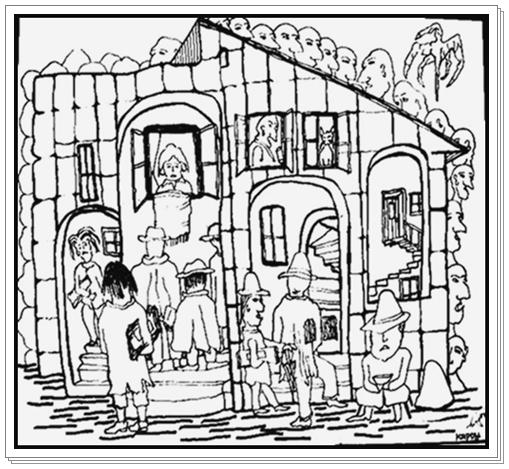 Mindkét oldalán sötétre pácolt ajtók tömegei húzódtak, csend, és mozdulatlanság időzött mögöttük, az éjjeliőr szerint éjszaka elevenedtek meg, a sötétben rozsdás zsanérok nyikorgása, és kopogó léptek zaja töltötte meg a széles folyosókat.